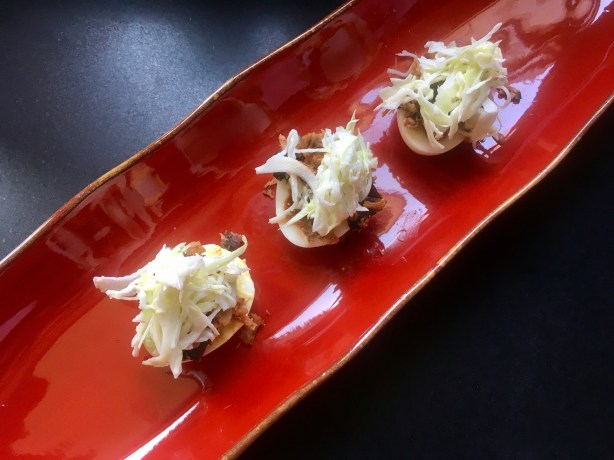 To assemble, take a teaspoon of the mayo/mustard/yolk mixture and place it in the cavity of one of the egg halves. Place another teaspoon of the shredded chicken on top (I like it warm, to counter the cold of the mayo and cole slaw), drizzling a little of the BBQ sauce that you cooked the chicken with on the meat. Then place a teaspoon of the cole slaw on top of the chicken.