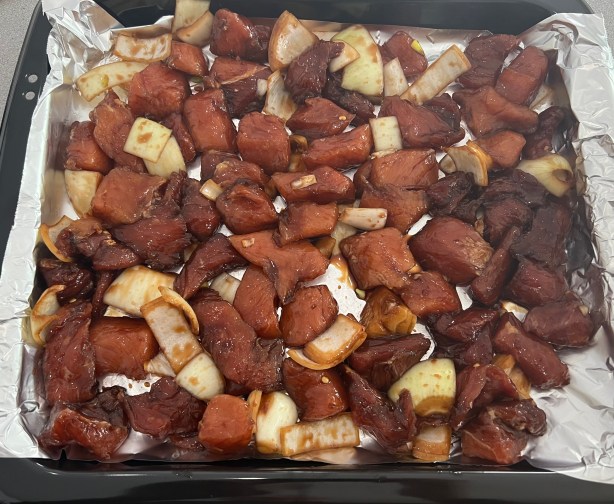 I line a baking pan with nonstick aluminum foil and place the pork and onion pieces on it in a single layer, reserving any leftover marinade for later.