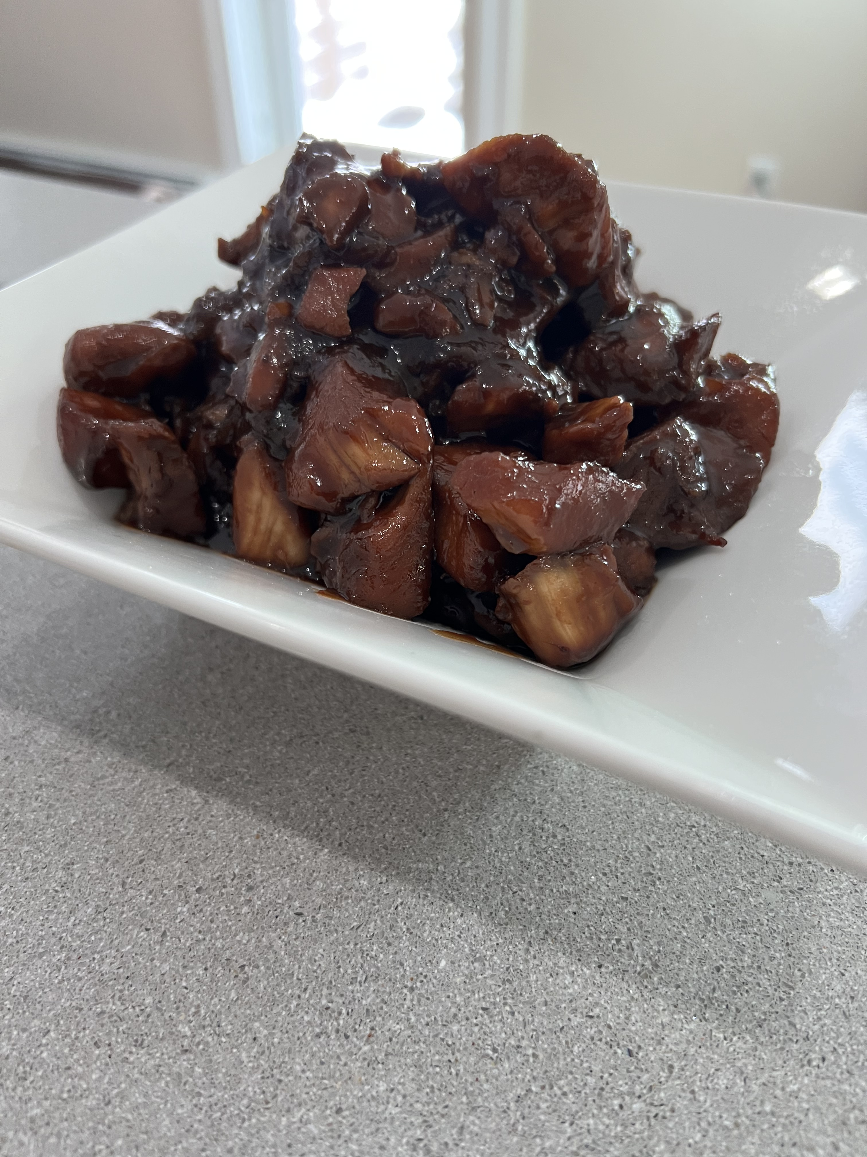 3 pounds boneless pork ribs 1/2 a large onion, diced 1/2 cup soy sauce 4 tablespoons hoisin sauce 1 teaspoon Chinese chili garlic sauce Zest and juice of 1 lemon 2 star anise 2 cinnamon sticks 1/2 cup maple syrup 4 cups chicken broth, preferably homemade