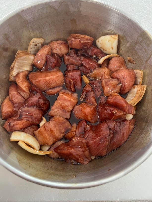 I cut the pork into 1-inch cubes, and toss them in a bowl with the diced onion. I add the soy sauce, hoisin sauce, and Chinese chili garlic sauce to the bowl and mix everything really well.