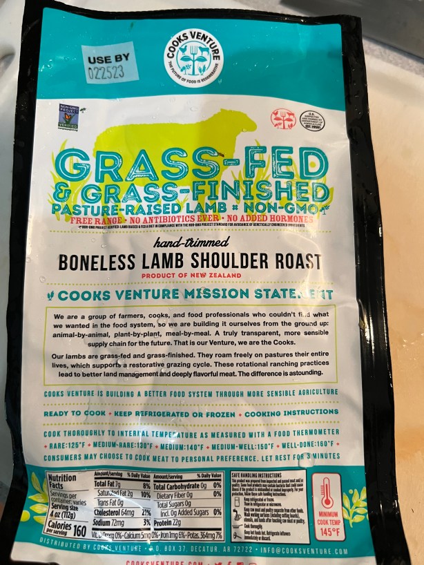 When I saw a New Zealand boneless lamb shoulder roast on their website, I had to buy it. Though New Zealand lamb can be a bit gamey to many people, I love that flavor, and there is no better quality of lamb than that from the land of the kiwi.