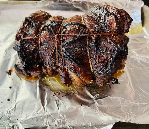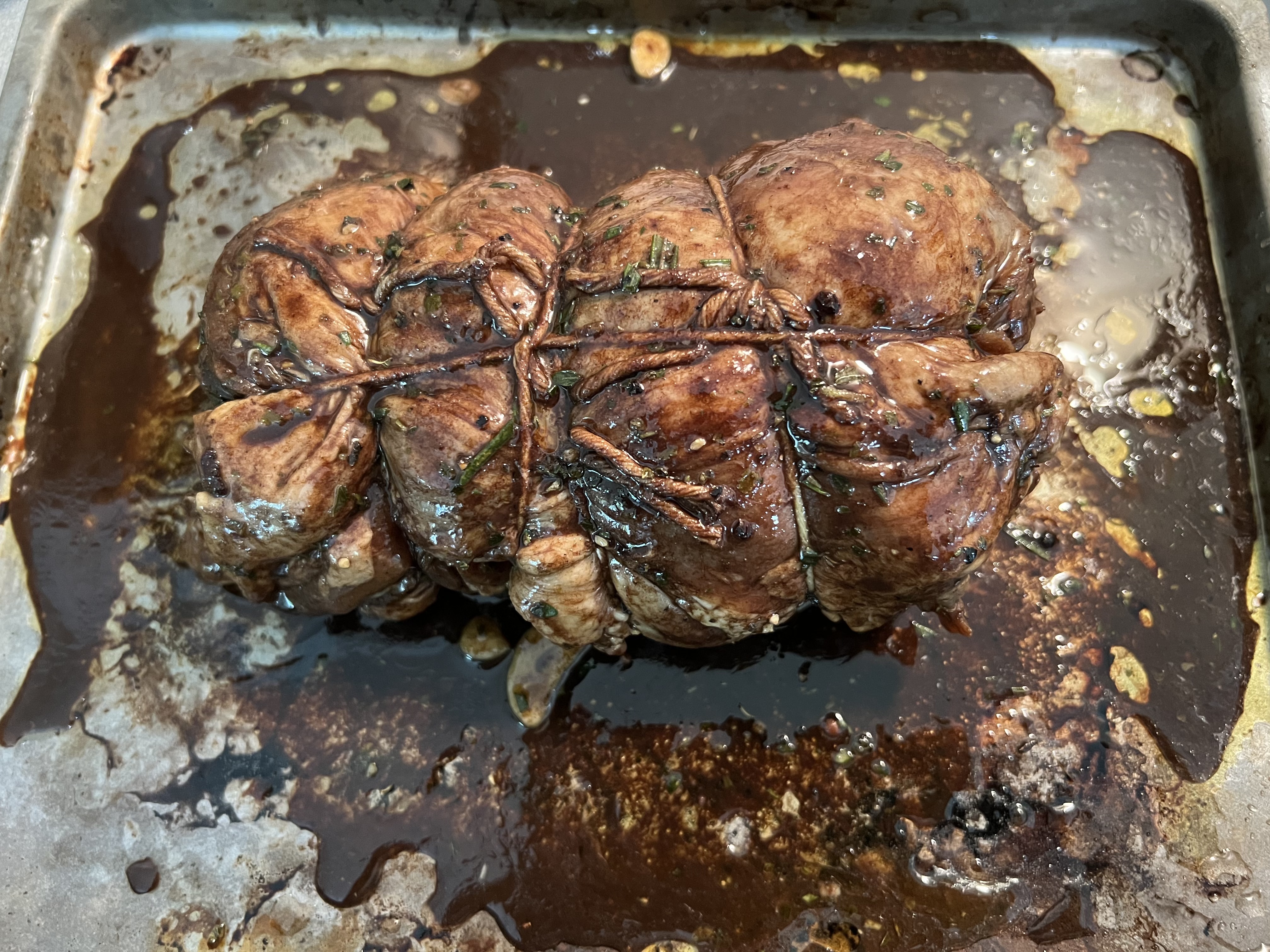Marinated, seasoned, re-rolled and re-tied. Ready for the oven.
