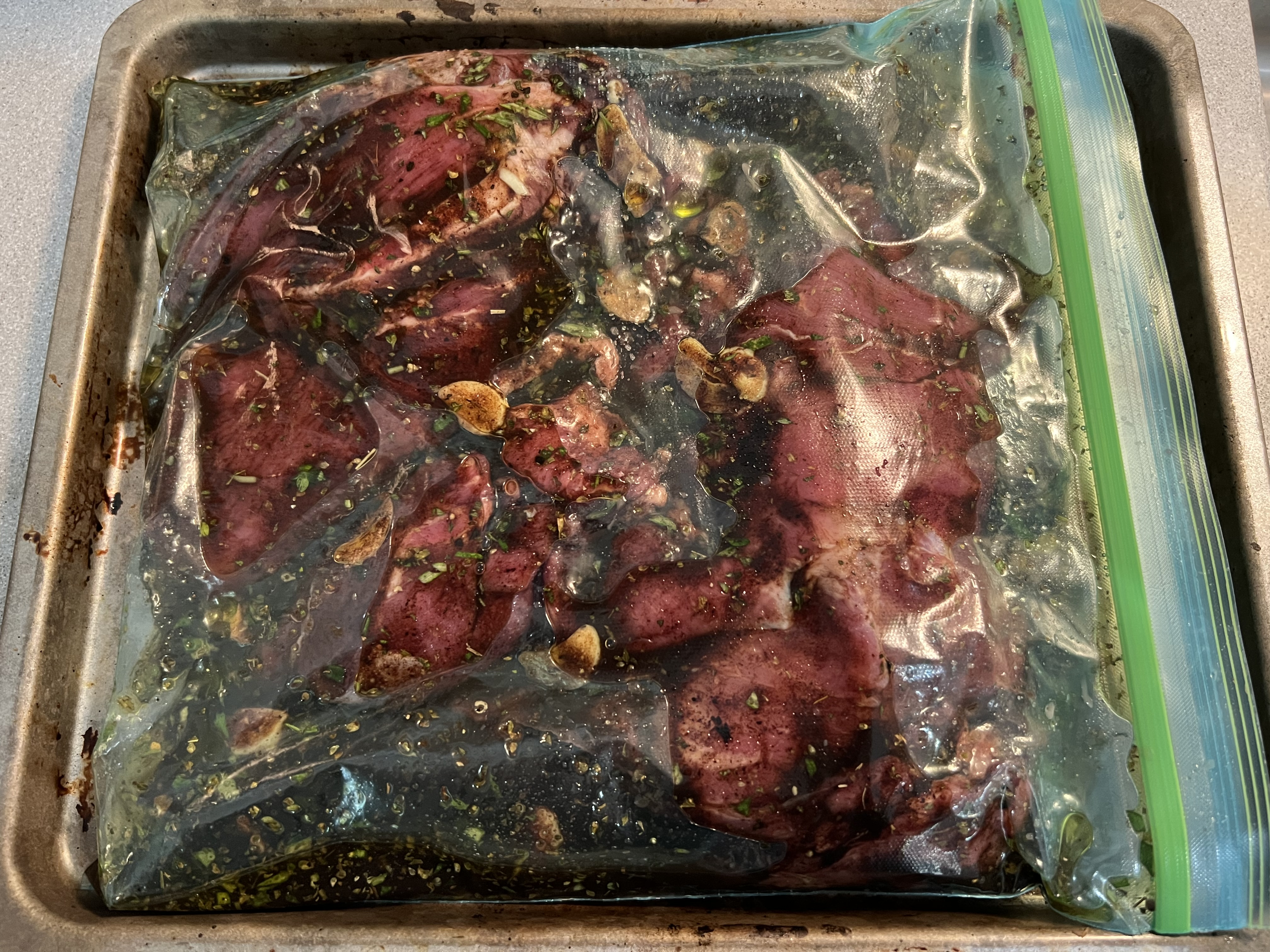 Place the lamb in a Ziploc bag, and pour in the marinade. Seal the bag tightly, squeezing any excess air out of it, and squish it around carefully, so that the marinade makes contact with every part of the lamb.