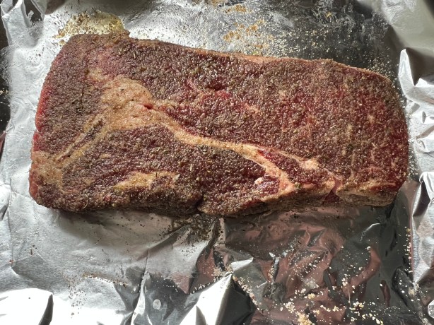 Rub the chuck roast with olive oil, and then rub the spices all over it, placing it in the foil and wrapping it. Place the foil in an oven-proof pan and bake it for about 2 hours, until tender.