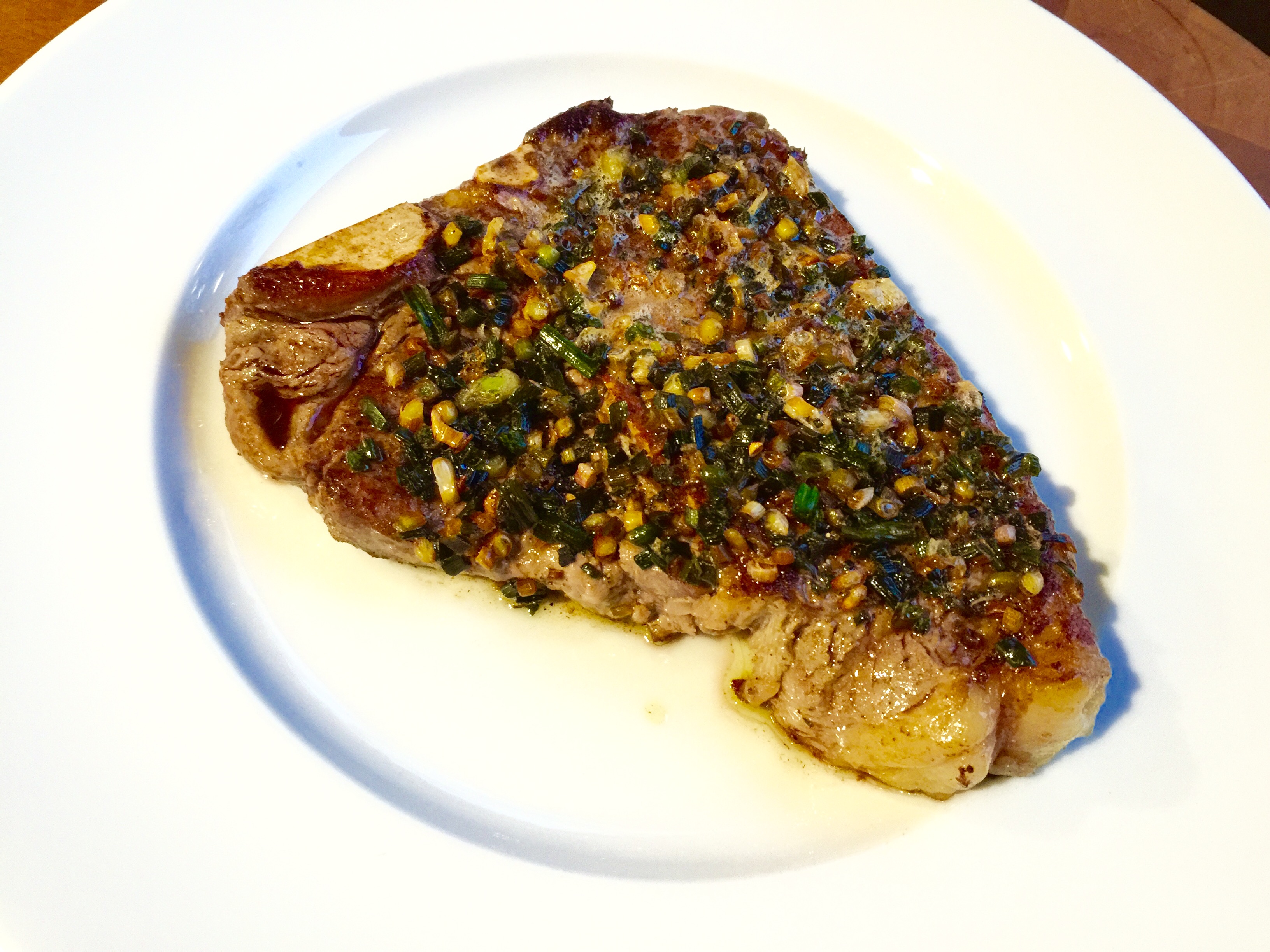 A perfect medium-rare porterhouse that was simply pan-seared. It was thin enough not to even go in the oven.