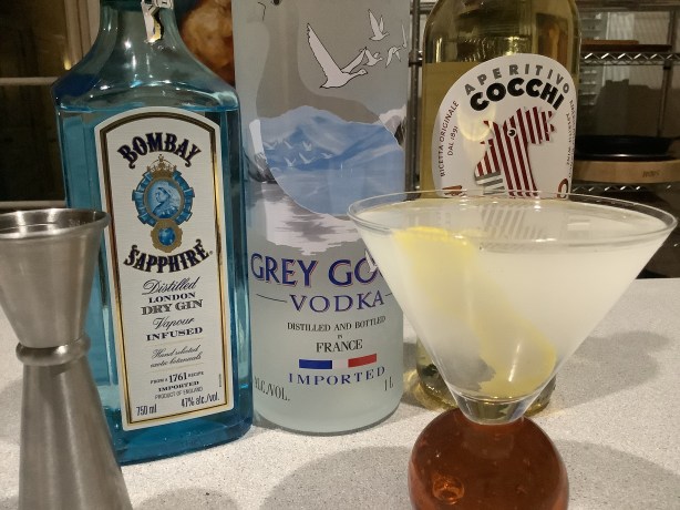 If you don’t want to spend the extra cash for Grey Goose, I found that this combination is also very satisfying: for the vodka, go with the original red label of Stoli with Bombay Sapphire gin and Cocchi Americano in the original proportions.