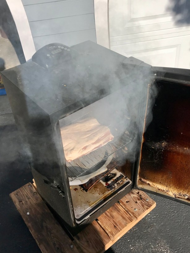 My electric smoker has a digital readout, which allows me to set an exact temperature. I smoke my pork belly at 250° for 2 hours, using hickory chips. (I’m not a fan of applewood, the other commonly used smoking wood for bacon.)
