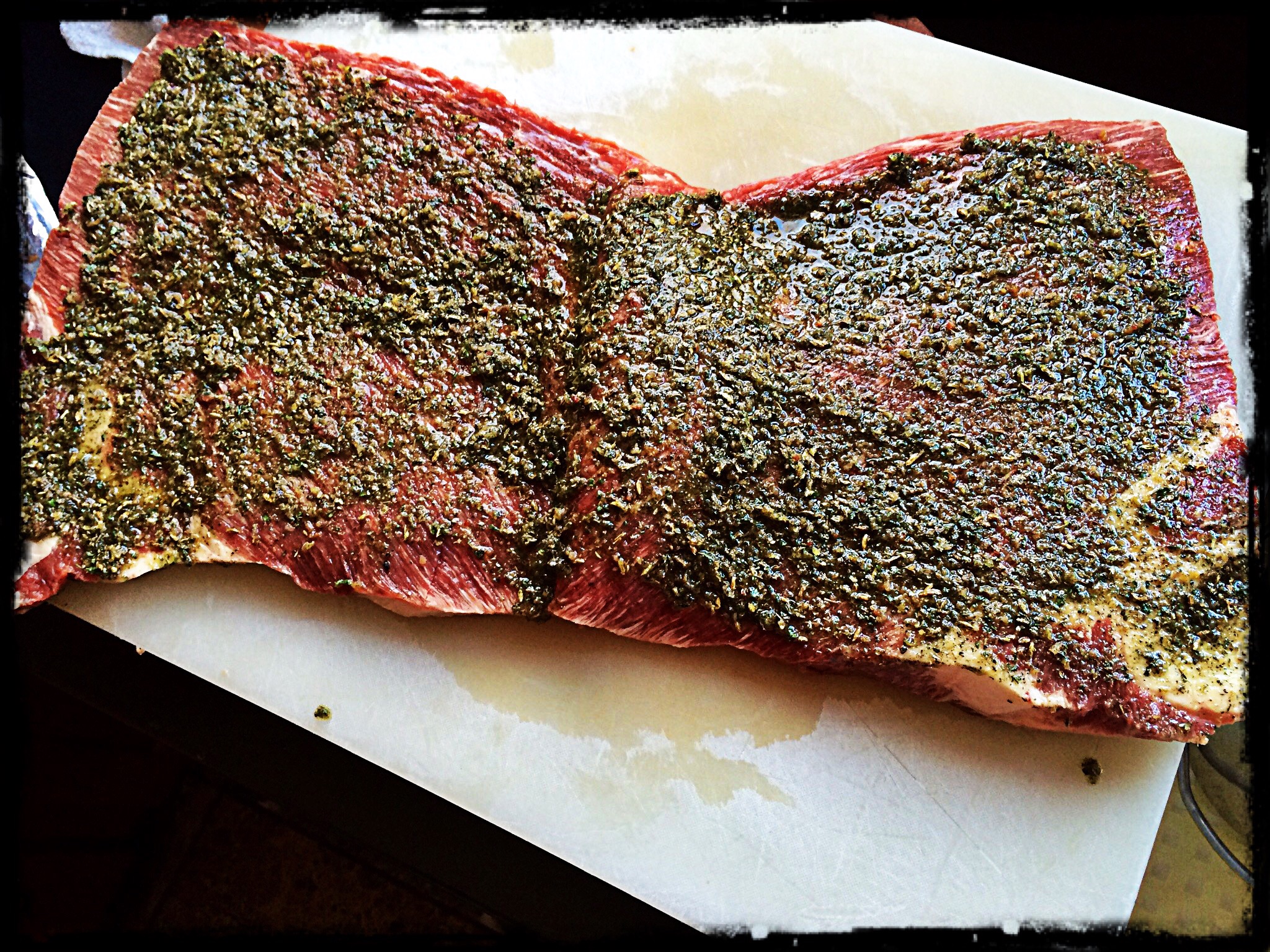 Now, rather than having a piece of meat that was only 1 1/2″ thick, I had a meat log that was 6″ thick. Much easier to cook and control. I tied the meat log up tightly with butchers’ twine and let it rest in my fridge overnight.