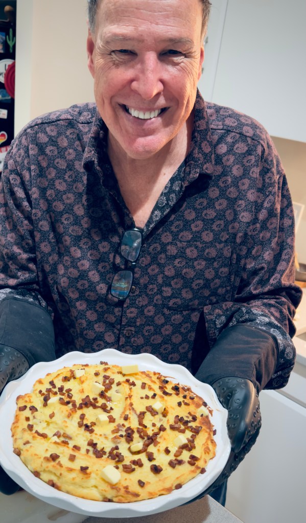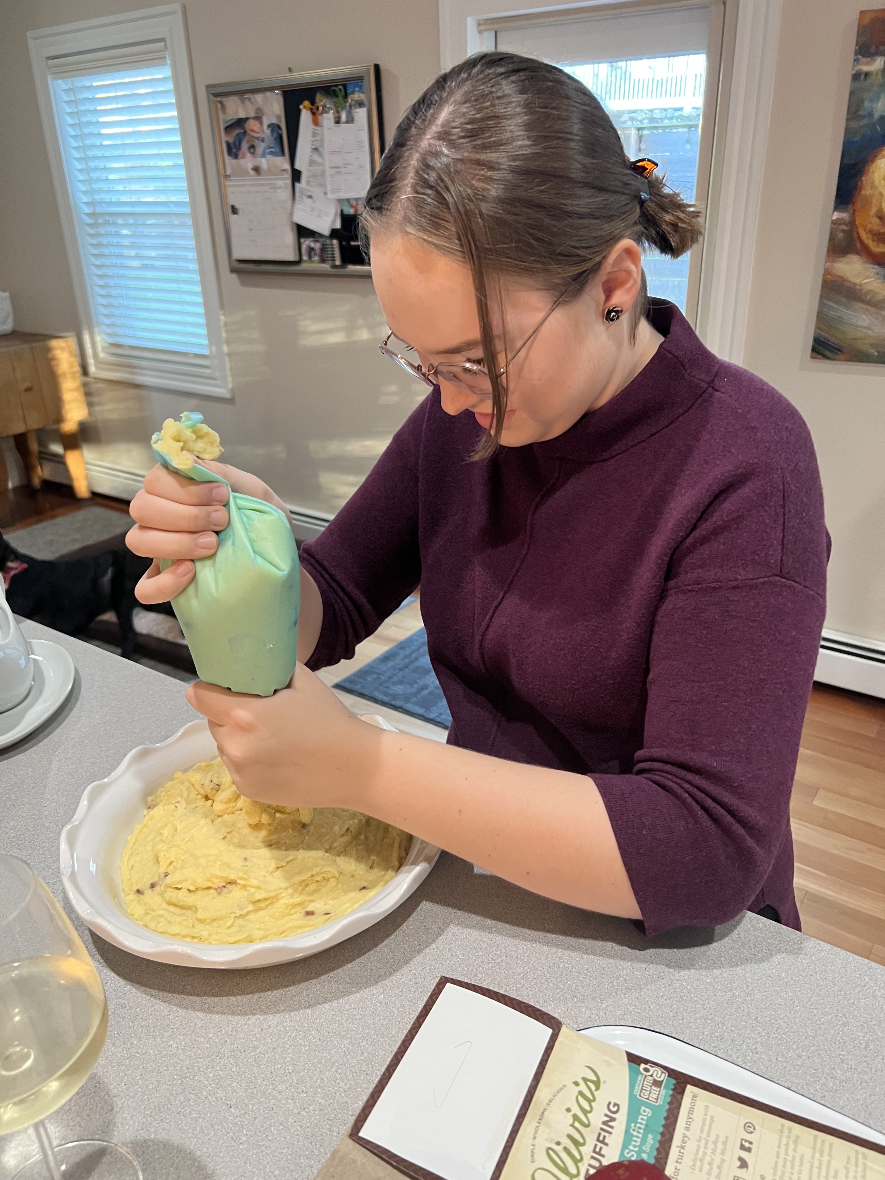 Grab your favorite baking dish, and pour in the mashed potatoes, smoothing them out to make them look nice. (We originally tried piping some of the potatoes with a pastry bag, but it kept getting clogged with the guanciale and we gave up!)