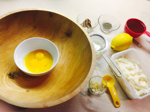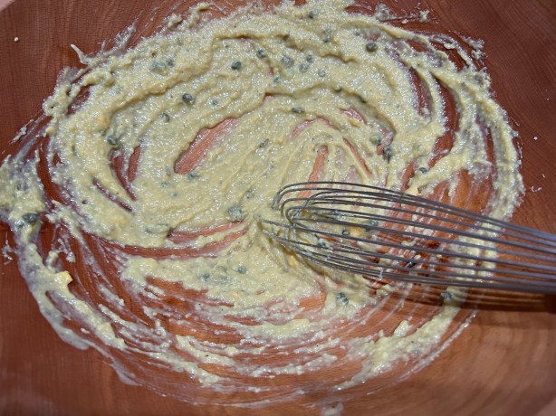 Chop up the two hard-boiled egg yolks and placed them in a large wooden bowl, big enough for the salad. Add the juice of half a lemon, the Dijon mustard, and the capers.
