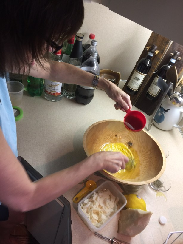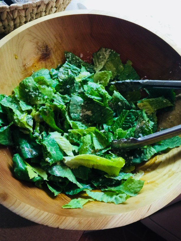 If you think you’ve “got it,” sprinkle in the Parmigiano Reggiano, whisking slowly. Then add the Romaine leaves to the salad bowl and toss gently to coat the lettuce.