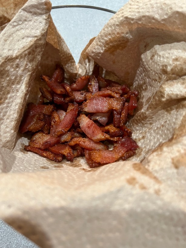 Fry up half a pound of bacon, leaving the fat in the pan. Make sure the bacon is crispy. Chop it up and place it in a bowl on paper towels. Set it aside.