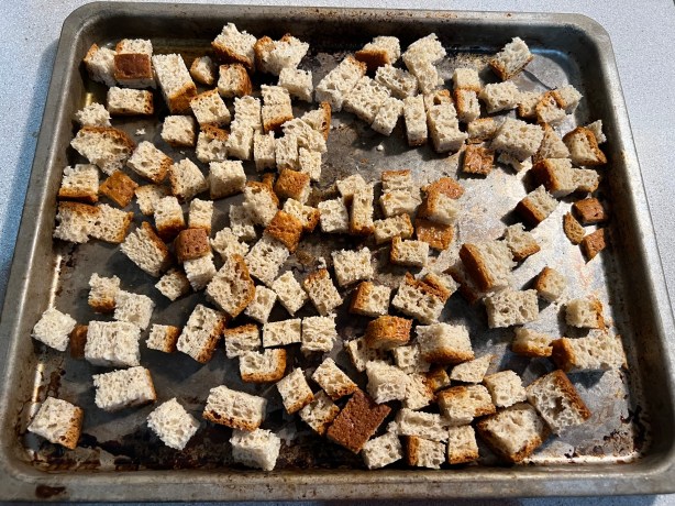Spread the bread cubes in a single layer on a sheet pan in a convection oven and bake it at a low temperature, 150° or so, until it’s brown and toasted, tossing the cubes around every 10 minutes. Remove it from the oven and set it aside.