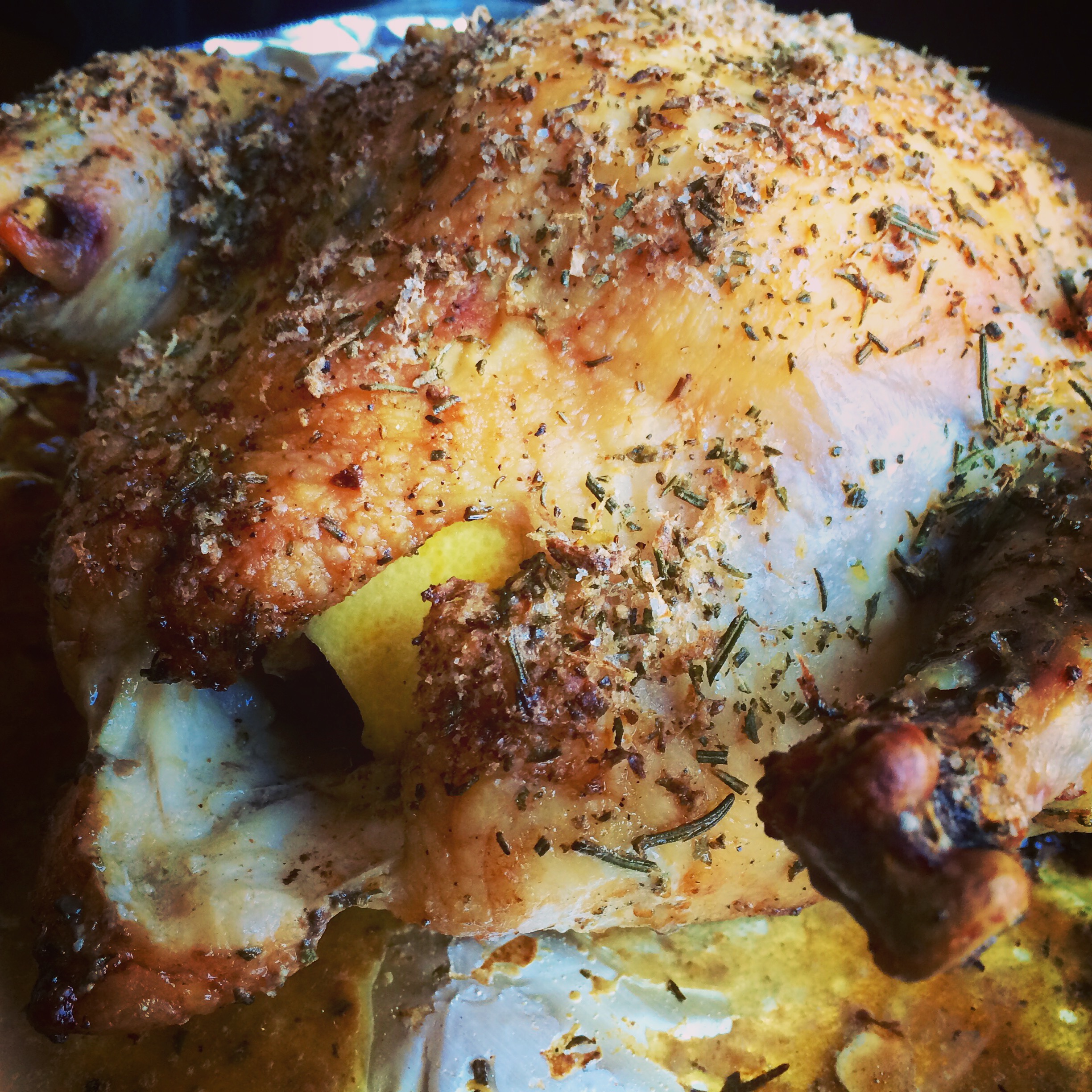 Thaw a bird, remove the giblets, and rub it all over with olive oil. Shove the quartered lemon pieces into the carcass of the bird. Season the bird inside and out with the rosemary seasoning mix.