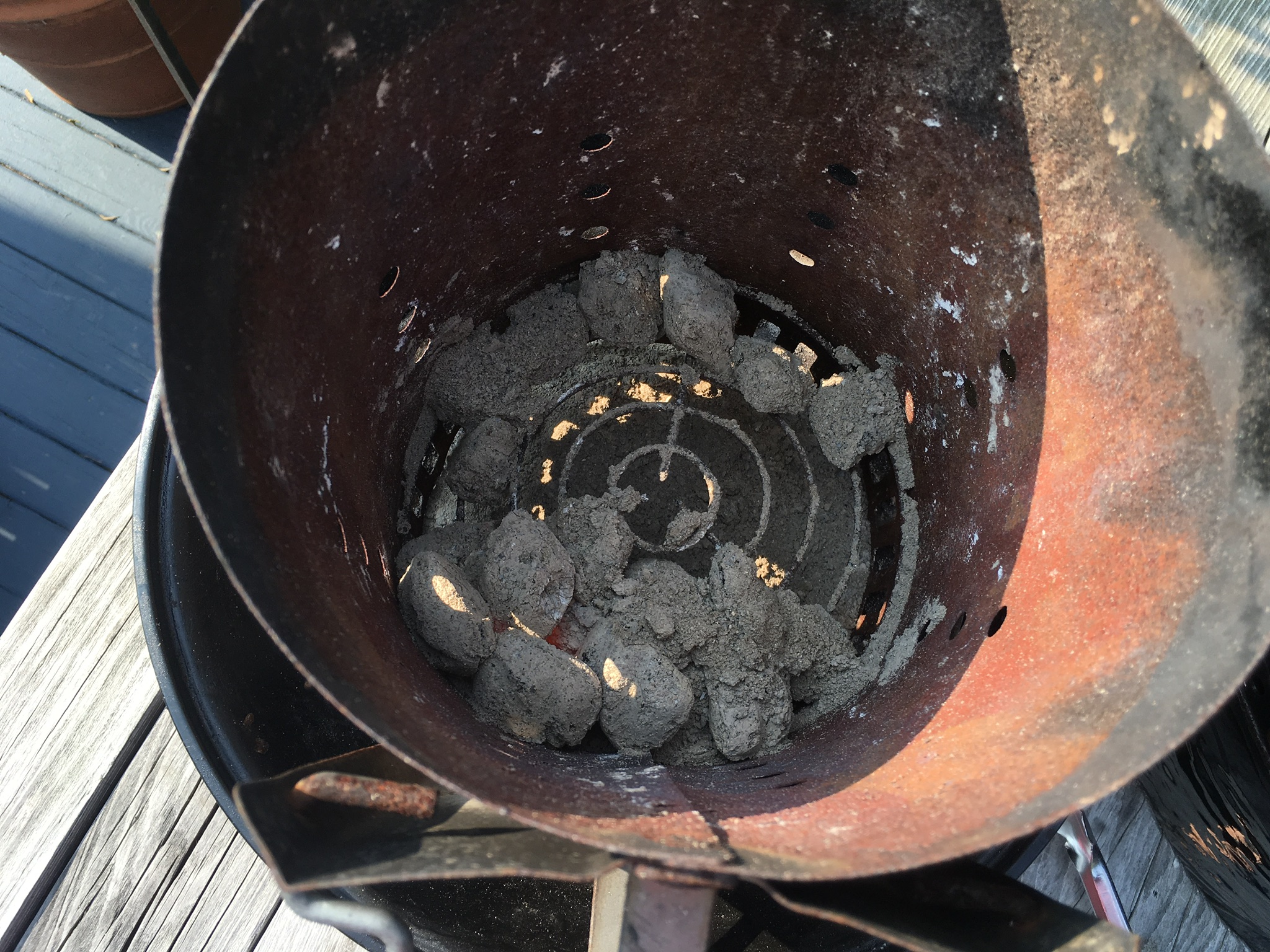 Lighting briquets in the camping grill before moving them to the larger grill.