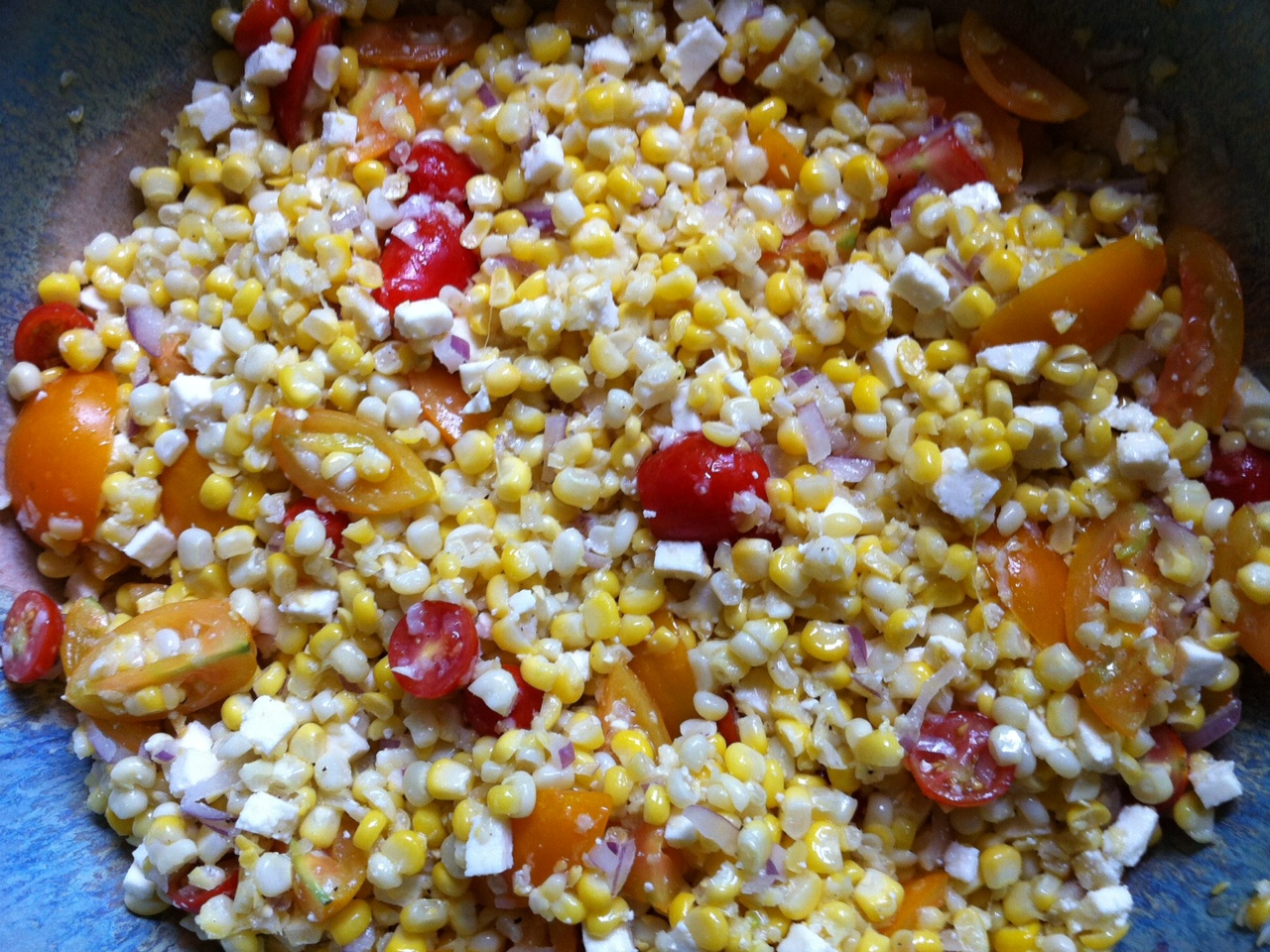 This is a simple salad you want to make now, while corn and tomatoes are still in season, but I’ve found that frozen organic corn and greenhouse tomatoes work pretty darn well.
