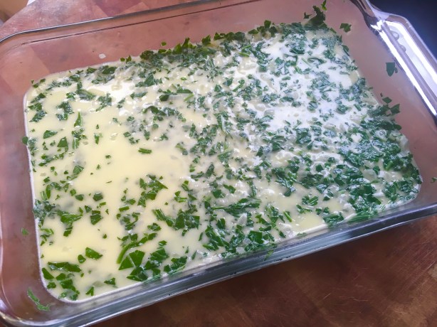 Combine the butter, garlic, parsley, and cheese in a sauté pan over medium heat. All you’re looking to do is to melt the butter, so once it’s melted, take the pan off the heat and this mix is ready to use.