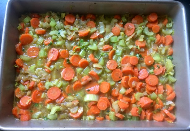 Place the bacon fat or oil in a pan and set it on medium high heat. Add the onions and the carrots and cook until the onions are translucent. Add the garlic and stir.