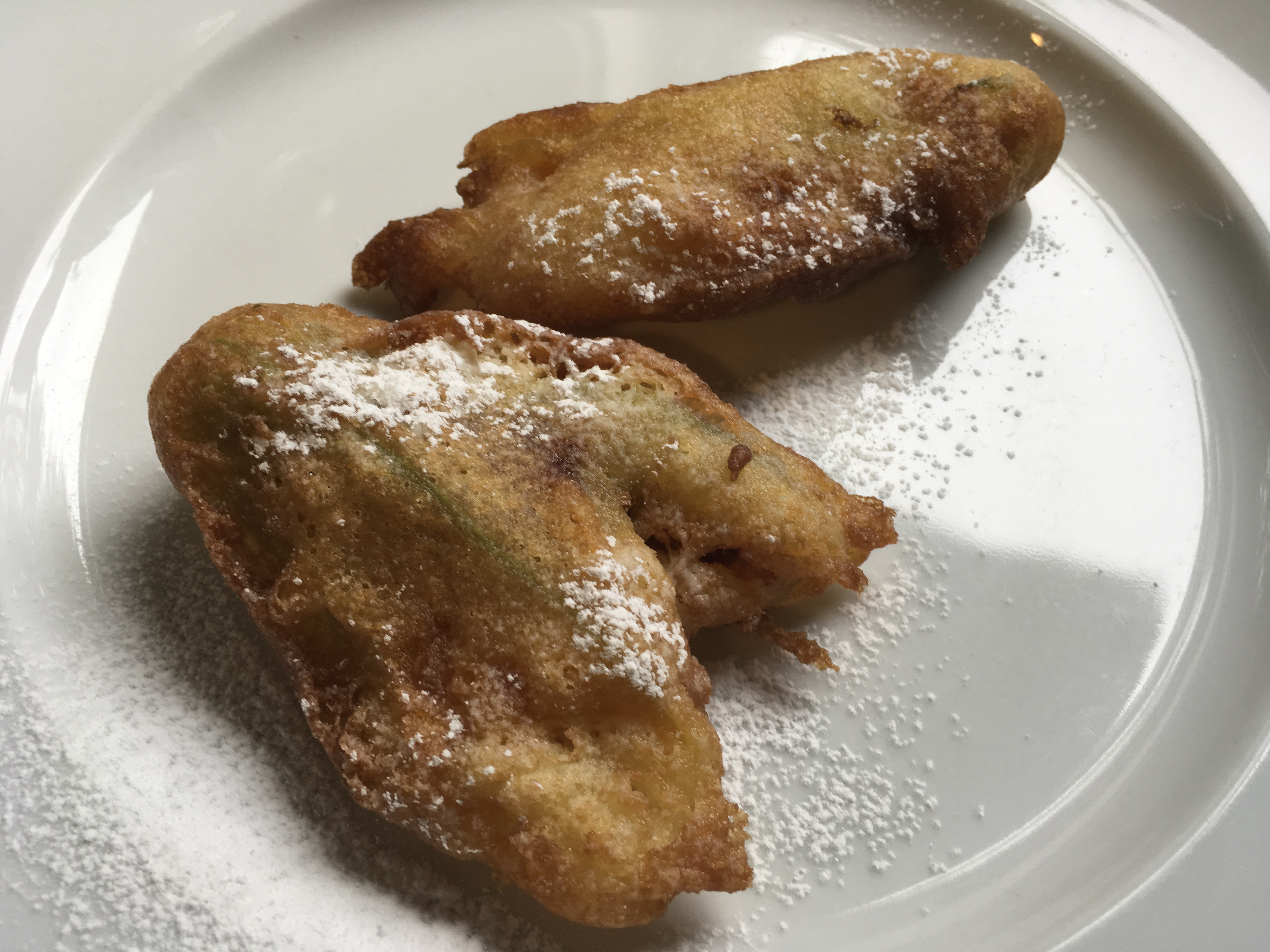 In my savory version, the blossoms are stuffed with ricotta cheese, lightly battered, fried and served with a delicious tomato sauce.