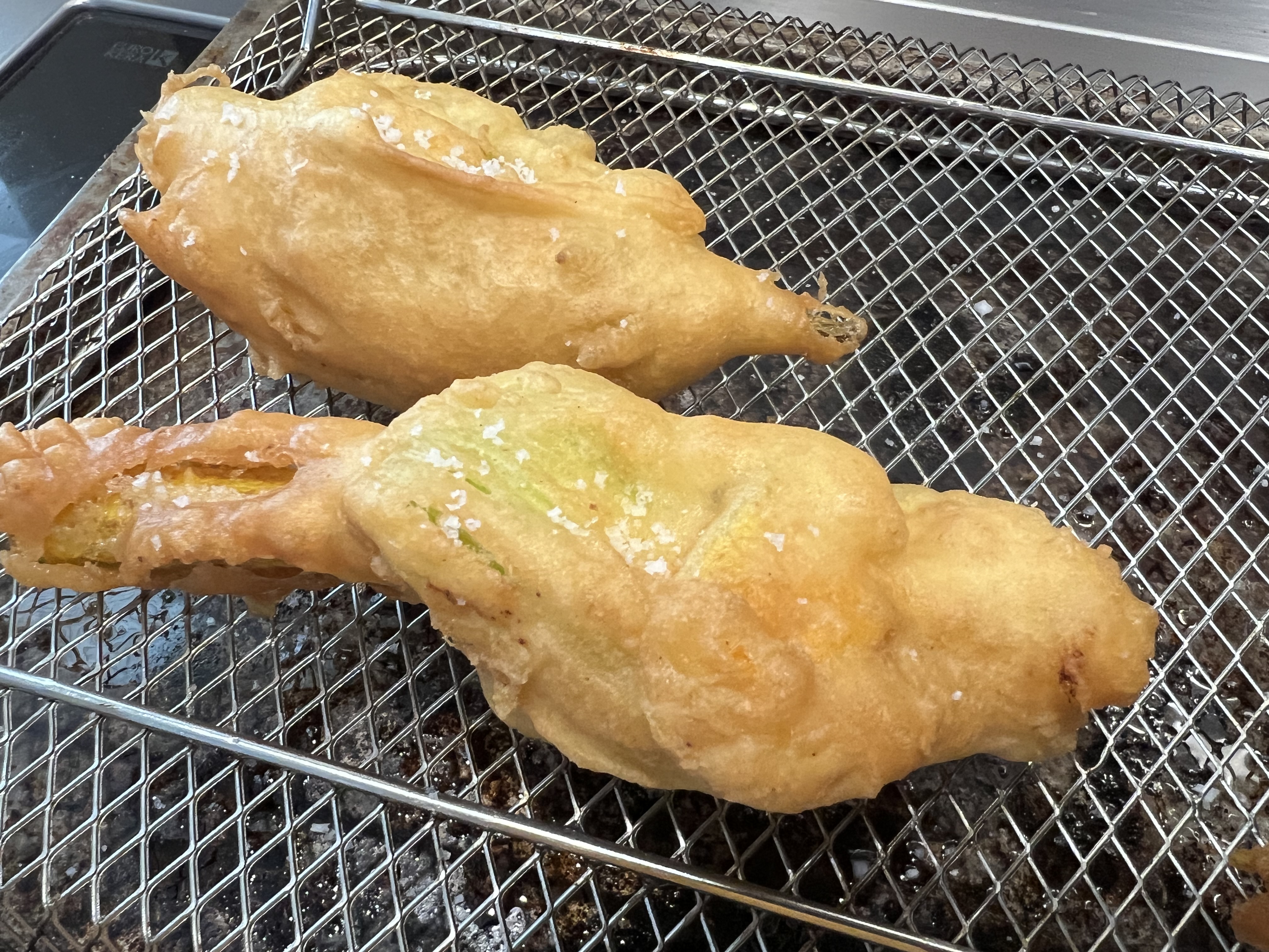 Stuffed and ready to dip in the batter. (I eat the baby squashes attached as well!)