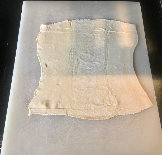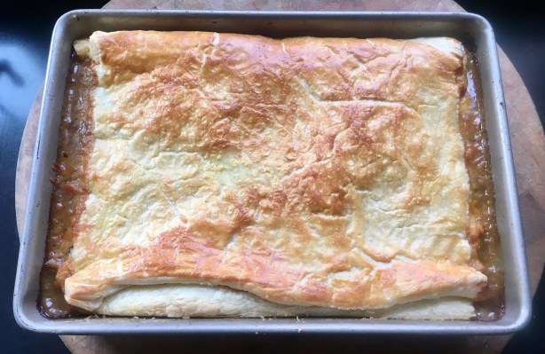 Remove it from the oven after 1 1/2 hours and stir it a bit to combine all the flavors. Put it back in the oven (covered) and cook another hour, until the meat is cooked and the stew is rich, dark and thick. If it’s still liquidy, place the pan on the stove top and reduce it until the sauce thickens. (You don’t want a soupy stew or you’ll get soggy puff pastry later.) Remove the pan from the heat and stir in half the cheese. Taste it to see if it needs seasoning, but remember there’s more salt coming when you add the rest of the cheese. Set it aside to cool.