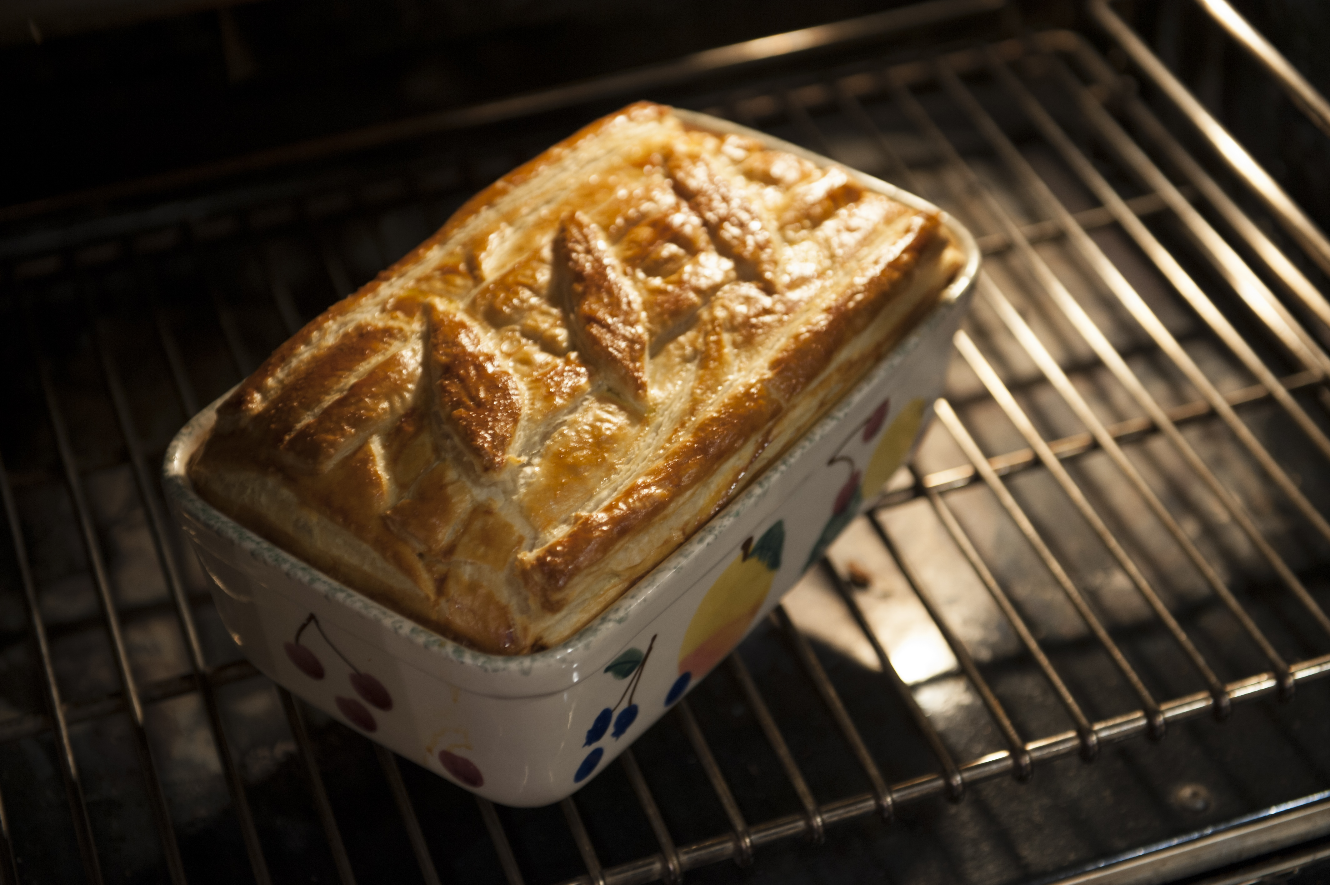 Depending on whether your puff pastry comes in sheets or a block, you’ll need to use a rolling-pin to get it into sheets about 1/8″ thick. Butter a good-sized pie dish or an oven-proof terrine, like the one in the photo above. Line the dish with the sheets of pastry, letting the pastry hang over the sides. Pour in the stew, even it out with a spatula, and add the rest of the grated cheese on top.
