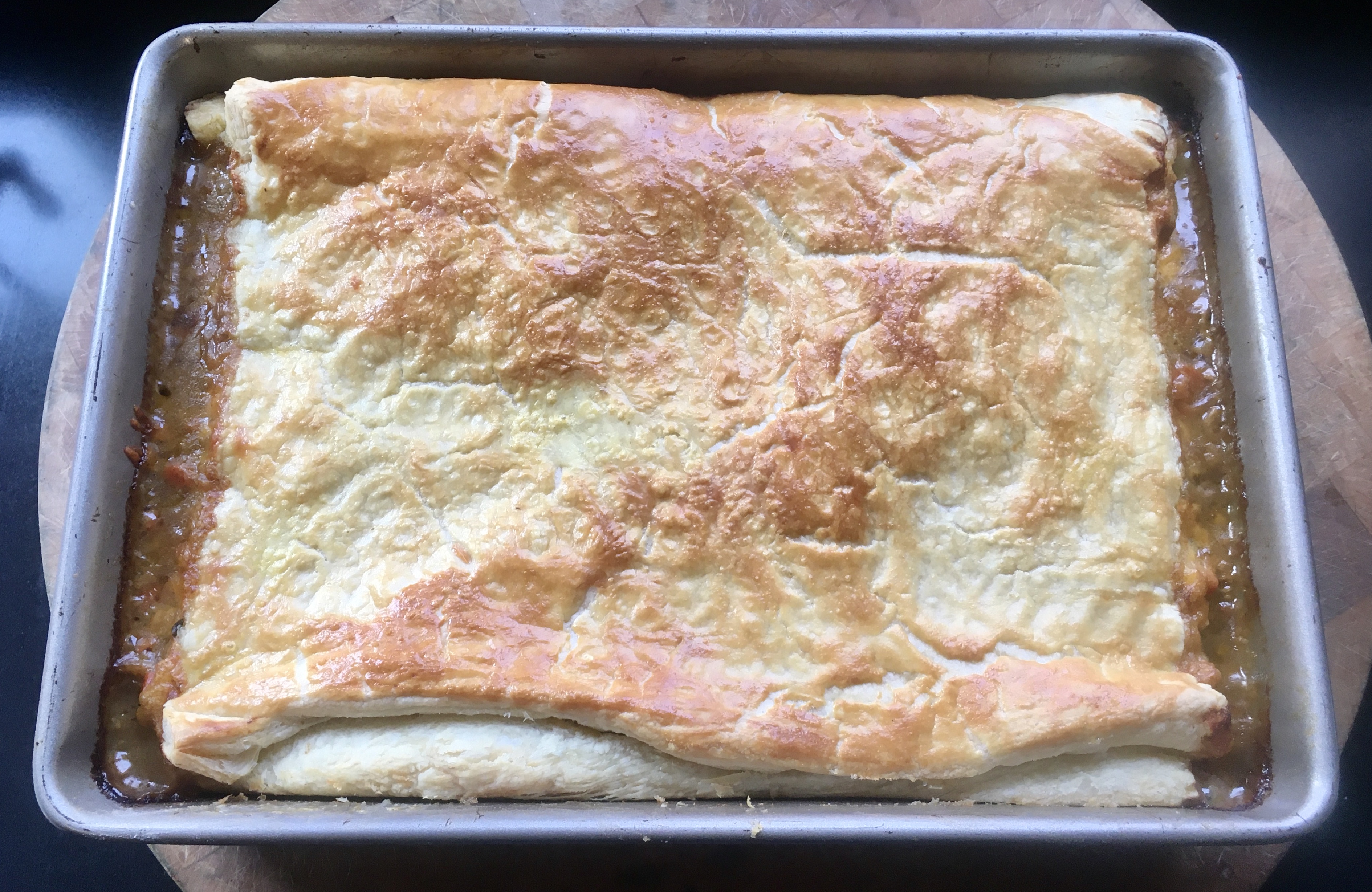 Use another 1/8″ thick sheet of pastry (or a couple if they’re not wide enough) to cover the top of the pie dish. Lightly crisscross the top with a knife, then fold over the overhanging pieces of pastry over the lid, making it look nice and rustic. Don’t cut or throw any of the extra pastry away! Find a way to use as much as you can, since everyone will want some.