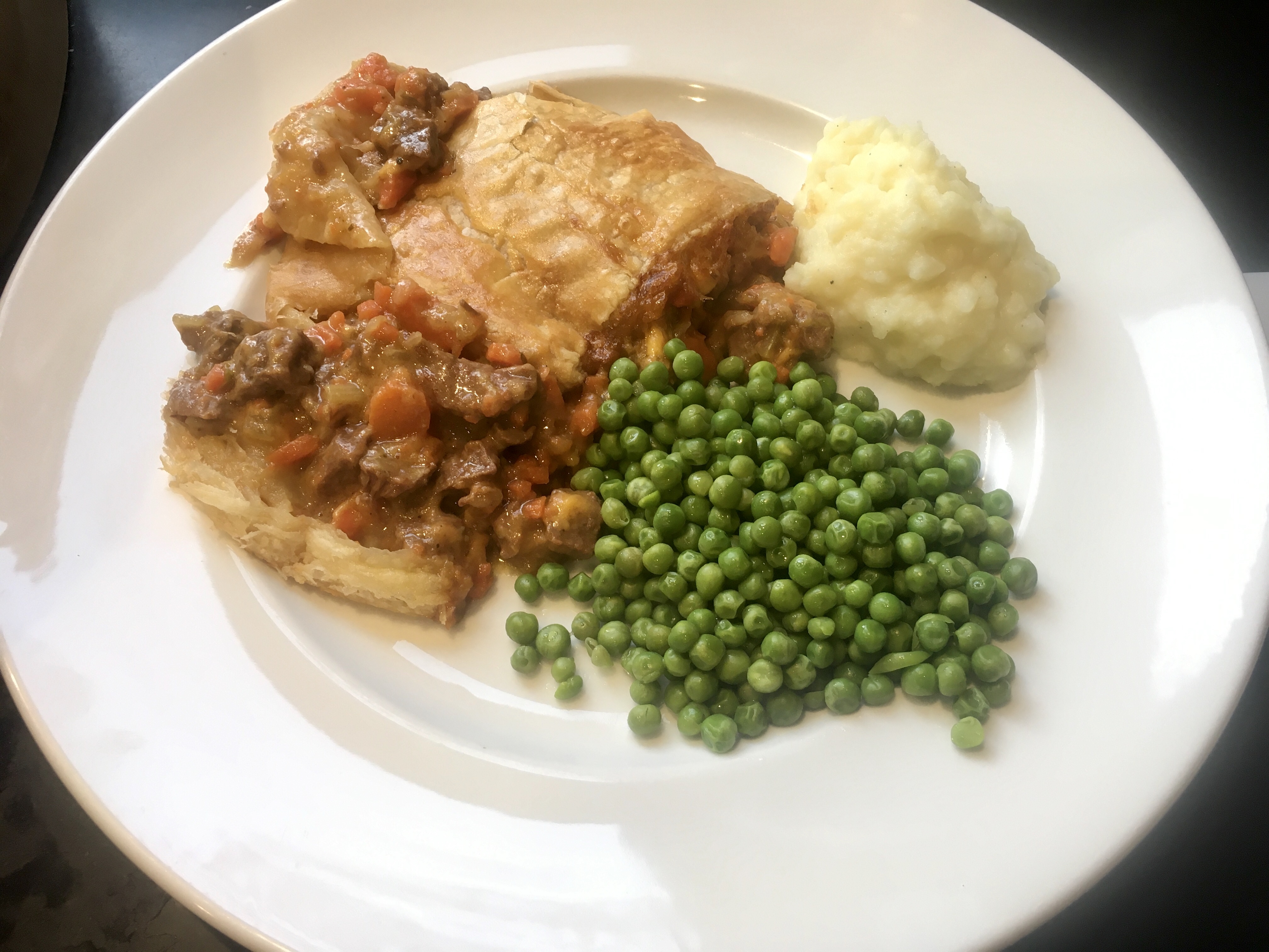 Brush the top with the beaten egg and then bake the pie on the bottom of the oven for about 45 minutes, until the pastry has cooked, and it’s beautifully puffed and golden. Serve with a side of peas (and beer!)