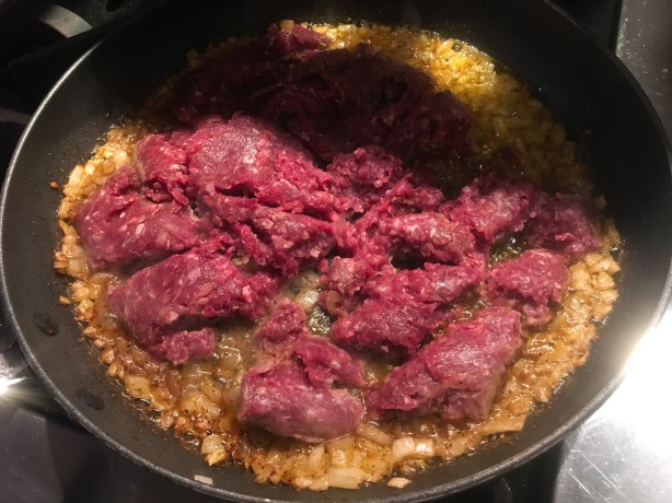 Sauté the onions in a bit of olive oil until translucent. Add the beef and sauté until cooked, mixing in the spice mixture a little at a time until you’ve used it all.