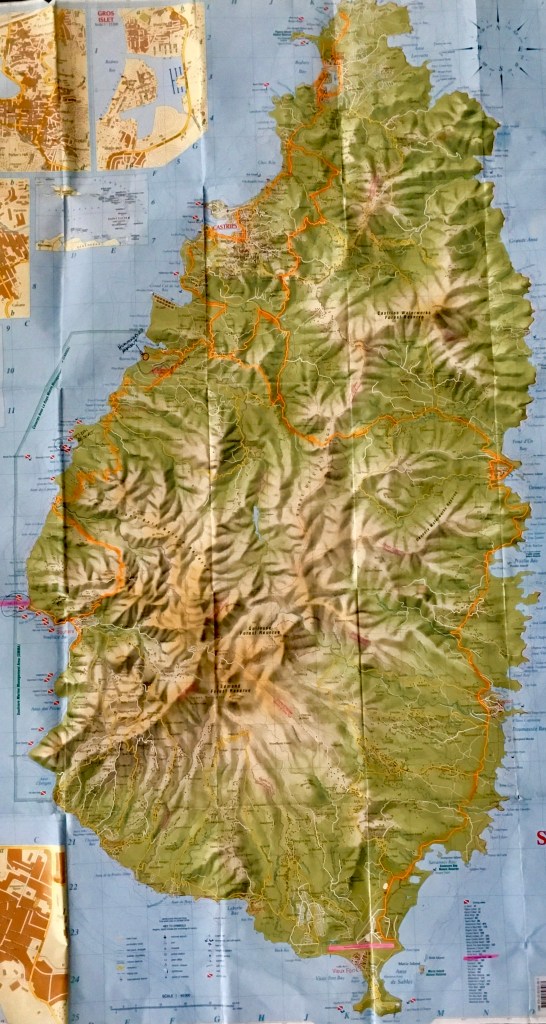 A map of St. Lucia I brought from home. The orange highlighted roads were all the ones I traveled on my trip! A lot of driving! The pink highlight at the bottom is the international airport…the pink highlight on the left is Anse Chastanet…and the black writing further up on the left is Marigot Bay, where I stayed.